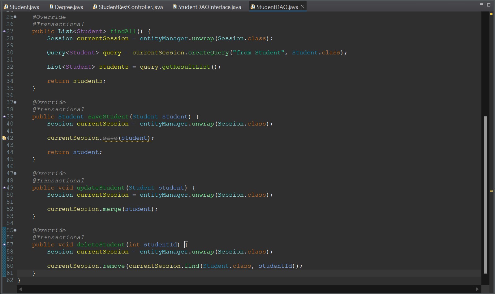 Now we just need to finish writing the methods by using the StudentDAO class to perform the CRUD operations for us.